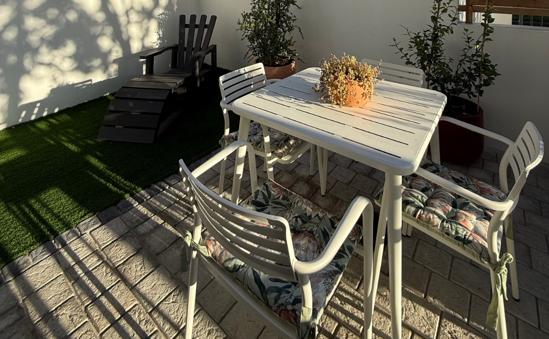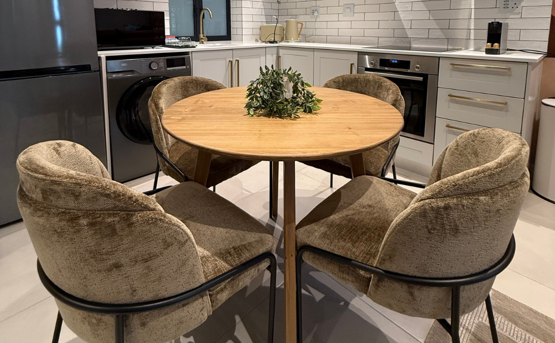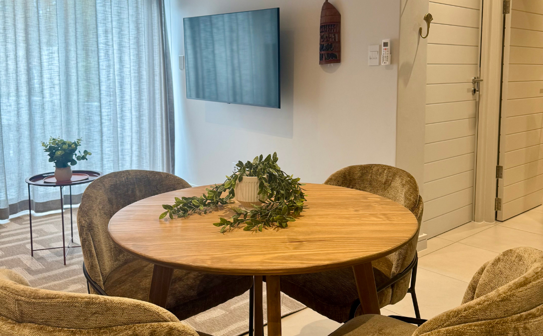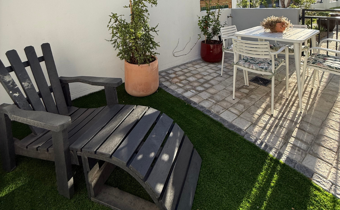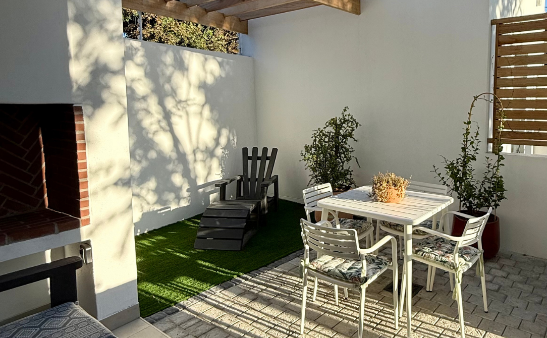 Our lovely Deluxe apartment features a king-size bed and sleeper sofa, with indoor and outdoor dining and lounging space in a corner area of the building. The ground floor unit offers ease of access with dedicated parking 10 steps away from the apartment. Tastefully decorated, the unit offers style, comfort and convenience, a short walk away from the trendiest spots in town. The apartment has a kitchen with modern appliances, dining area and lounge with Smart TV, with access to Netflix, DSTV, Showmax, and Amazon Prime Video (use own log-in) and air-conditioner. Relax in the fresh air in your private garden area featuring dining space, sun lounger and braai/BBQ.